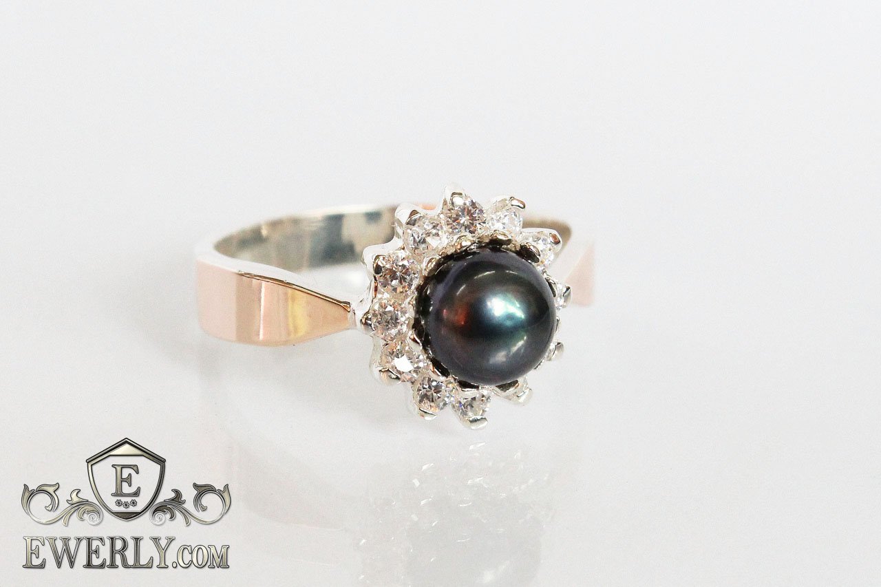 Женское серебряное кольцо с золотом и чёрным фианитом в виде жемчуга